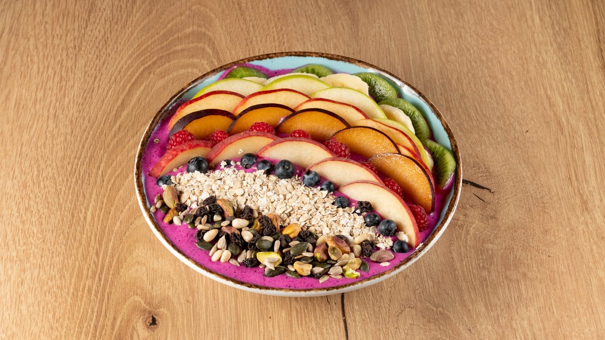Dragon fruit, ξηρούς καρπούς, γάλα βρώμης, σιρόπι σφενδάμου και εποχιακά φρούτα