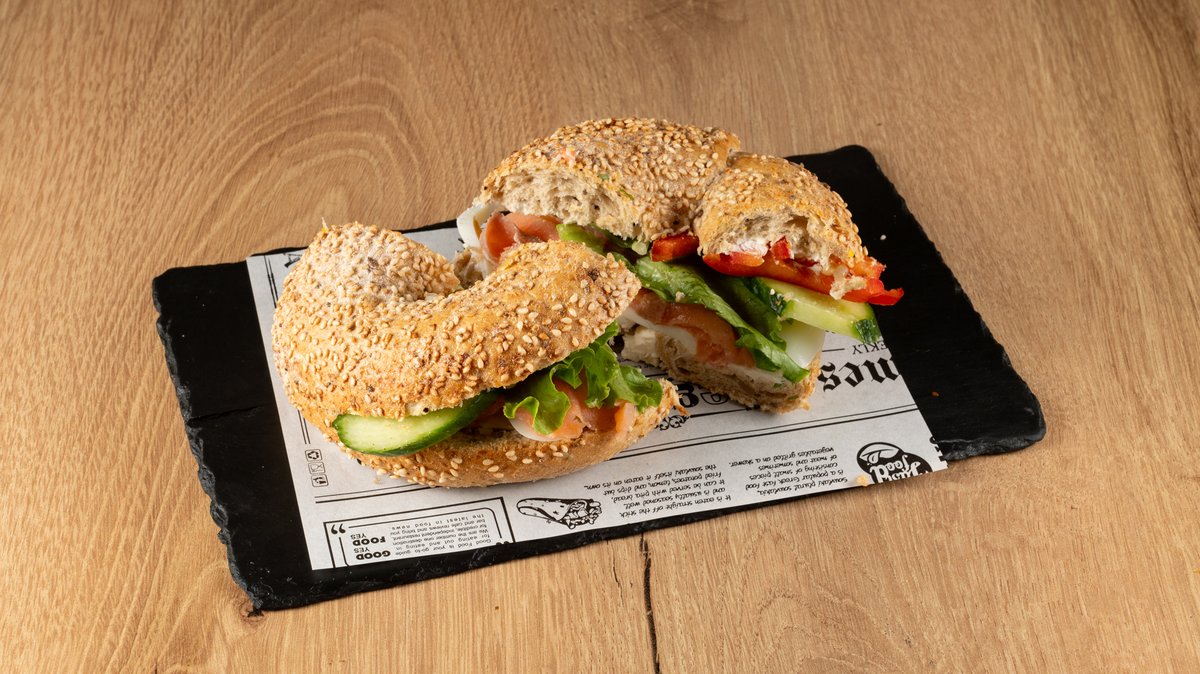Bagel με τυρί κρέμα, σολομό, αγγούρι, πιπεριά και αυγό