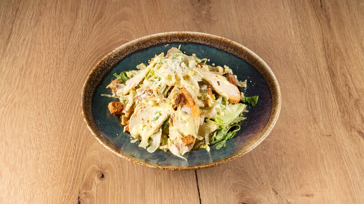 Με iceberg, καλαμπόκι, τραγανά κρουτόν, φιλέτο κοτόπουλο, μπέικον, παρμεζάνα, σως