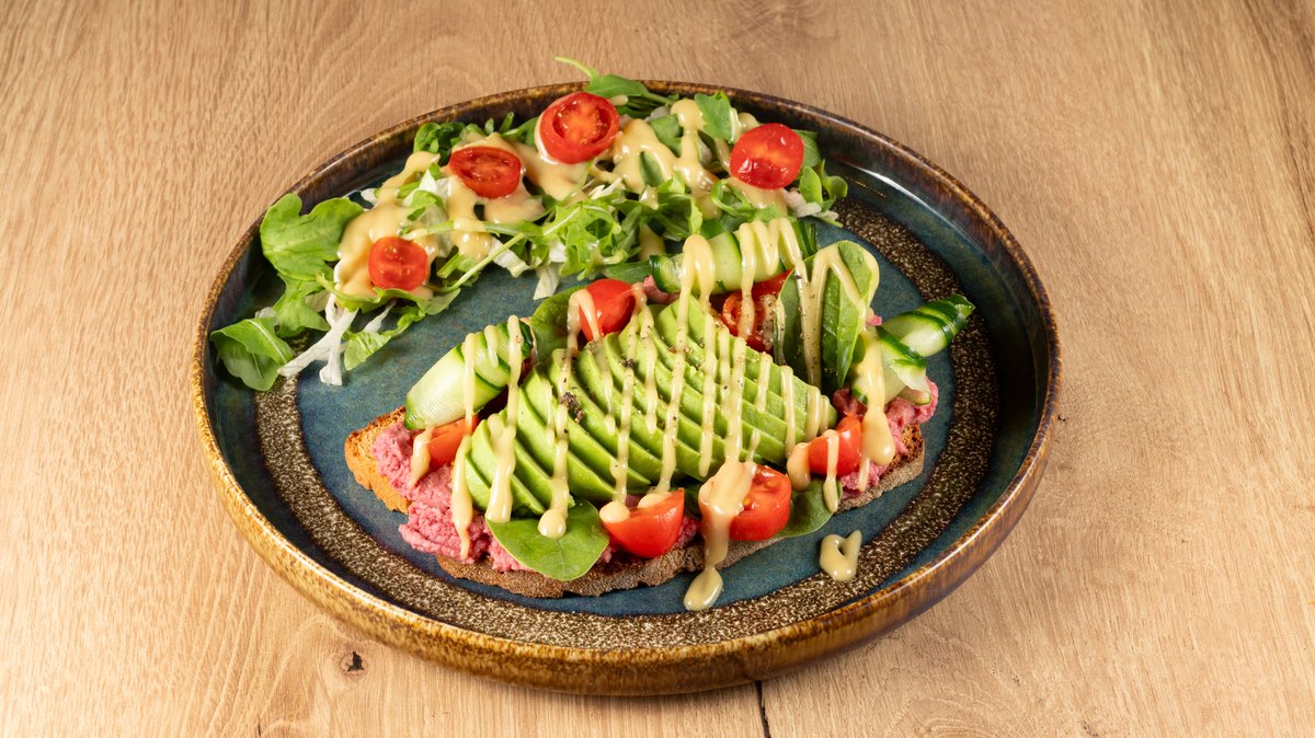 Χωριάτικο ψωμί με αβοκάντο, χούμους παντζαριού, αγγούρι, ντοματίνια και βινεγκρέτ μελιού
