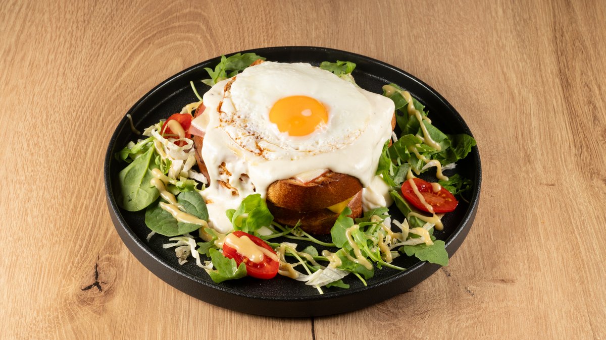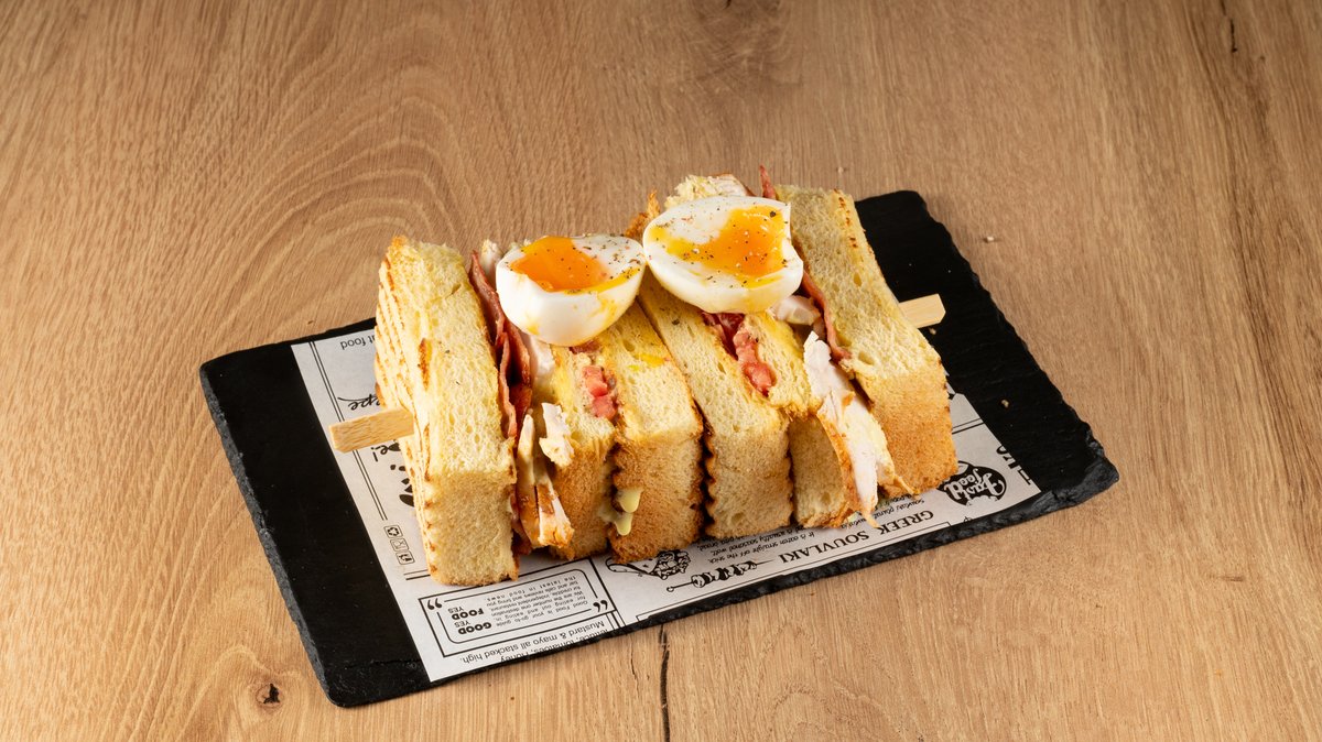 Τοστ brioche με λιωμένο τυρί, γλυκόξινη σάλτσα, καπνιστό ζαμπόν, τηγανητό αυγό, μπέικον και παρμεζάνα