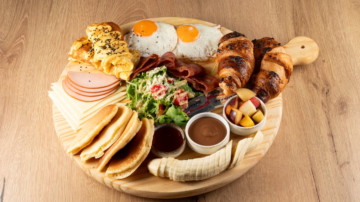 Δύο αυγά μάτια, ομελέτα, μπέικον, λουκανικάκια, τυρί, ζαμπόν, κρουασάν βουτύρου, pancakes, μαρμελάδα και πραλίνα