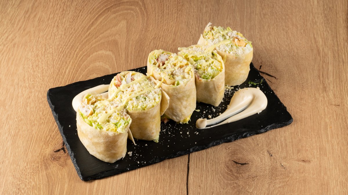 Τορτίγια με φιλέτο κοτόπουλο, iceberg, καπνιστό μπέικον, παρμεζάνα, αυγό και σως μουστάρδας
