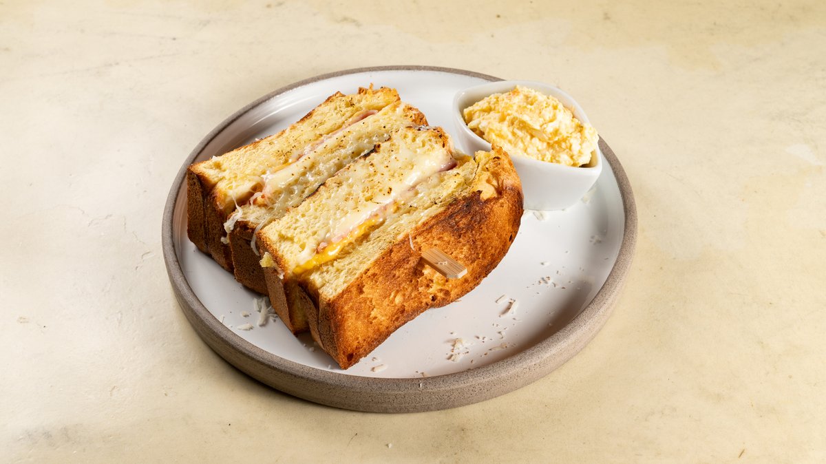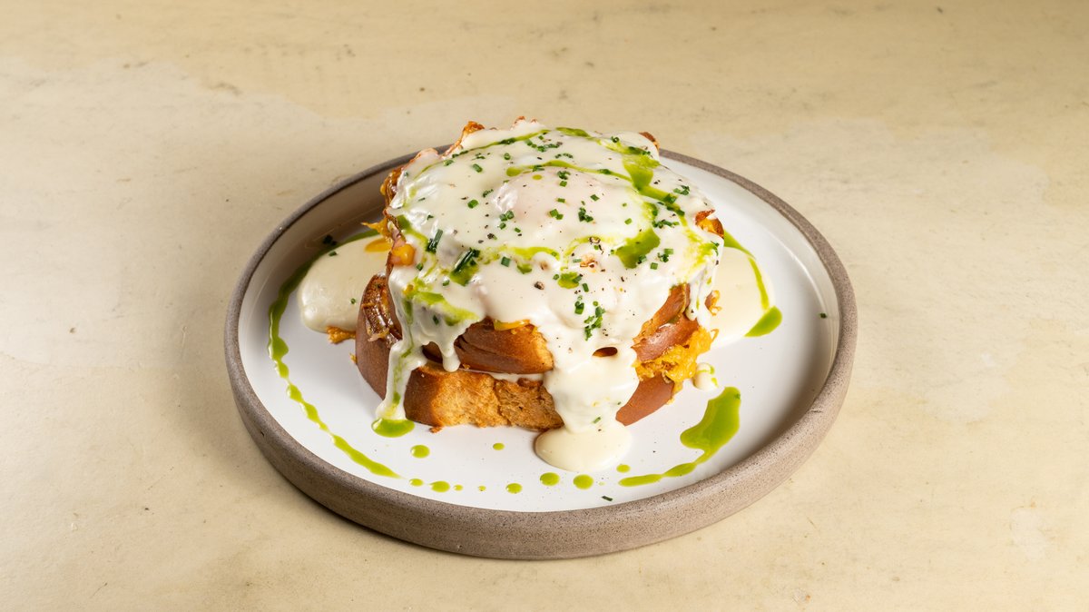 Με τηγανητό αυγό, καπνιστό ζαμπόν, μαγιονέζα, σάλτσα γραβιέρας σε ψωμάκι μπριός