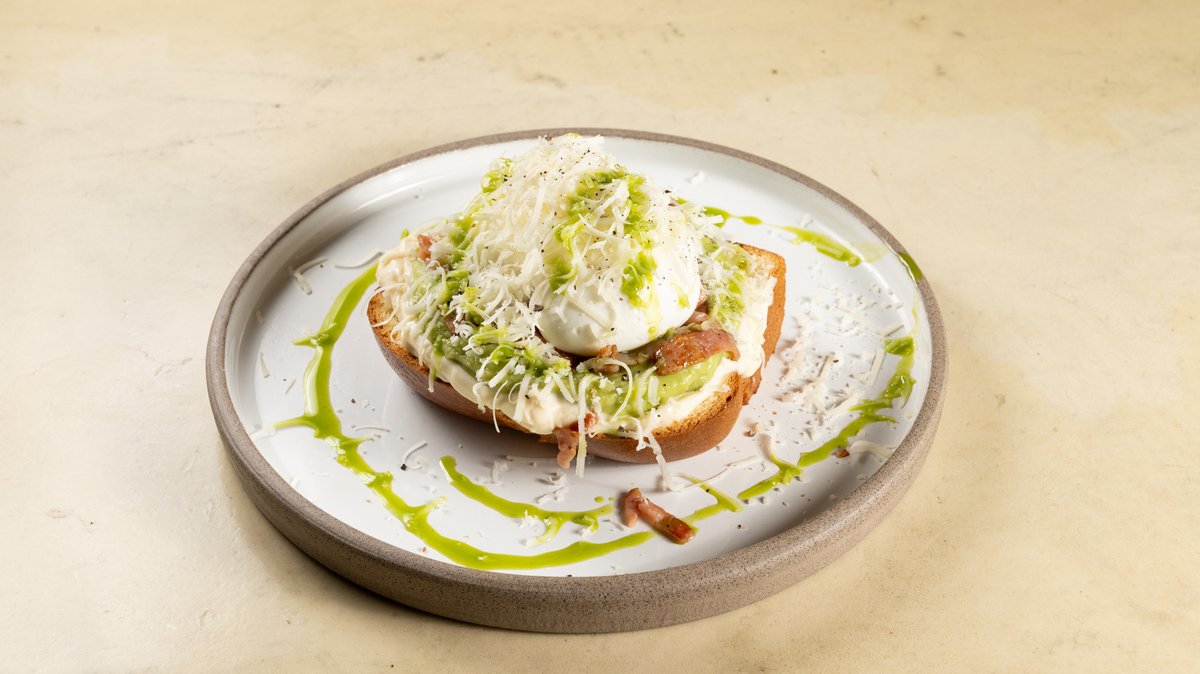 Με αυγά ποσέ, αβοκάντο, μπέικον και τριμμένο πεκορίνο