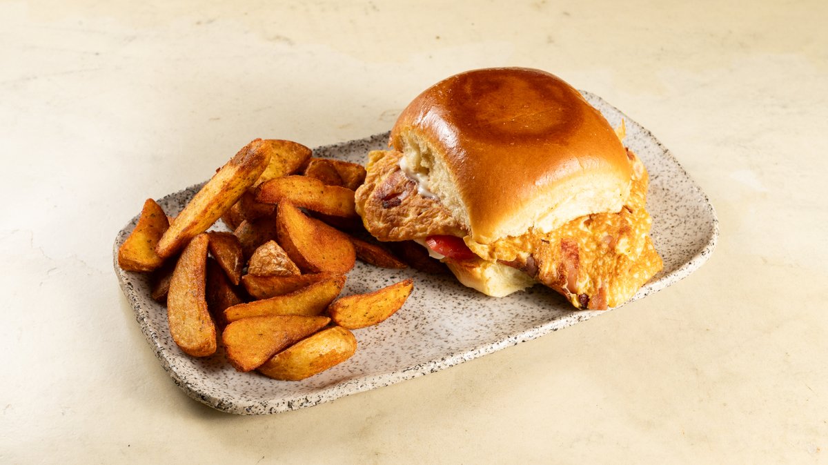 Με ομελέτα, μπέικον, ντομάτα, μαγιονέζα, πατάτες τηγανιτές