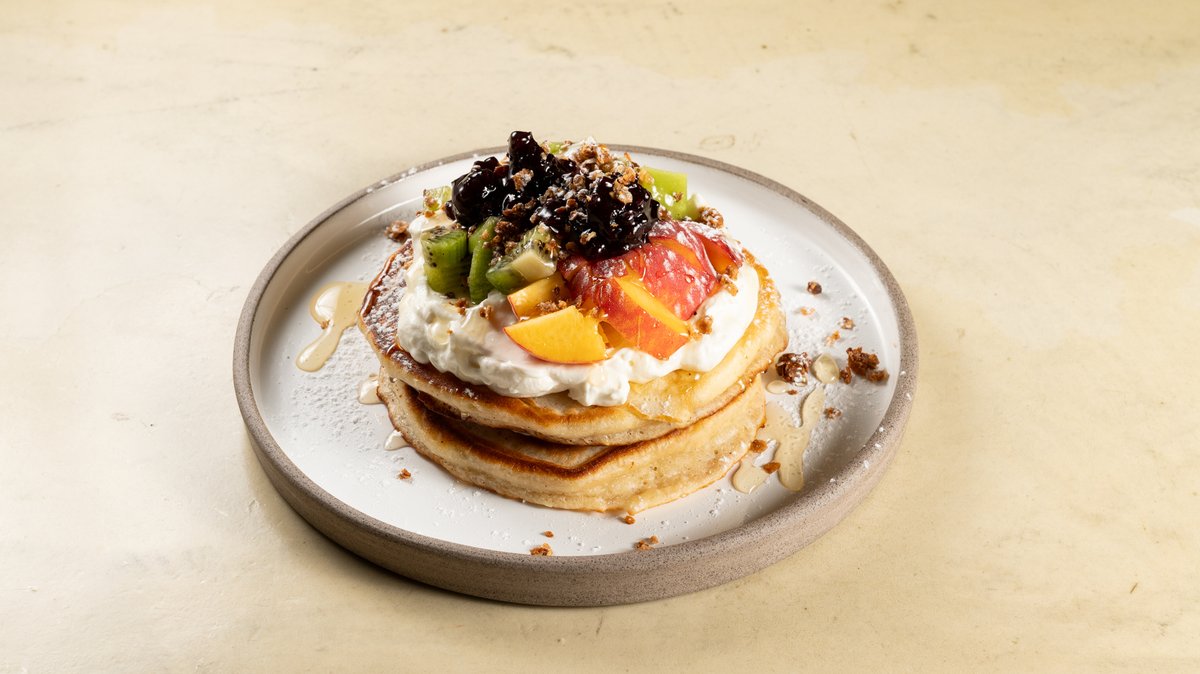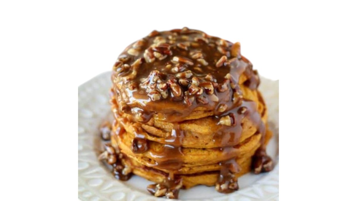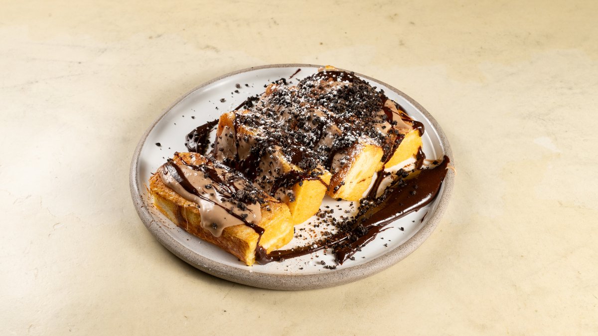 2 αυγά τηγανητά, τραγανό μπέικον, ψητά λουκάνικα, κουλούρι Pretzel Τηγανίτες, ντιπ με μαρμελάδα και πραλίνα