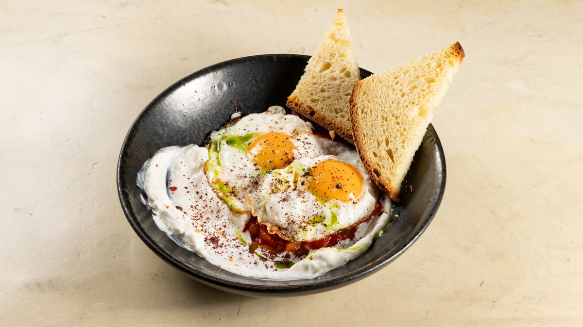 Με σάλτσα φρέσκιας ντομάτας, γιαούρτι, τηγανητό αυγό, ζυμωτό ψωμί και βούτυρο τσίλι