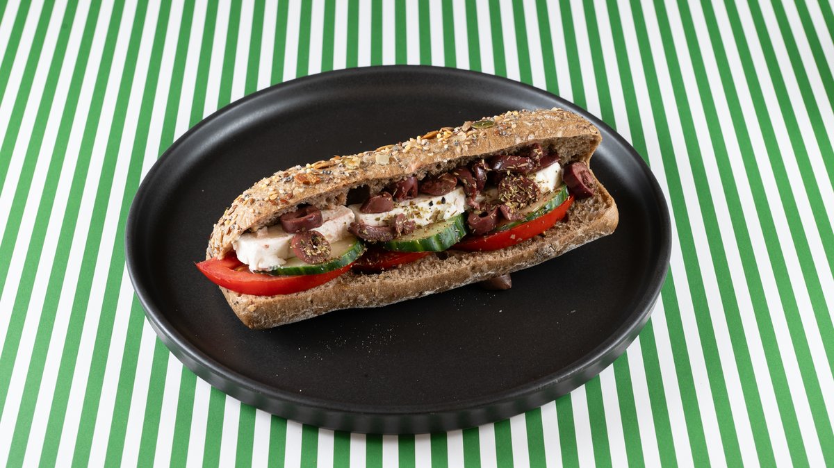 Σάντουιτς ολικής, με φέτα, ντομάτα, ροδέλα ελιάς, ρίγανη και αγγούρι