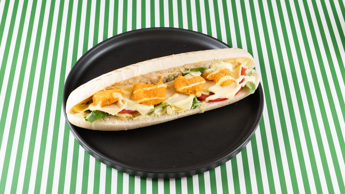 Λευκό panini, κοτομπουκιές, τυρί, ντομάτα, ρόκα και σως