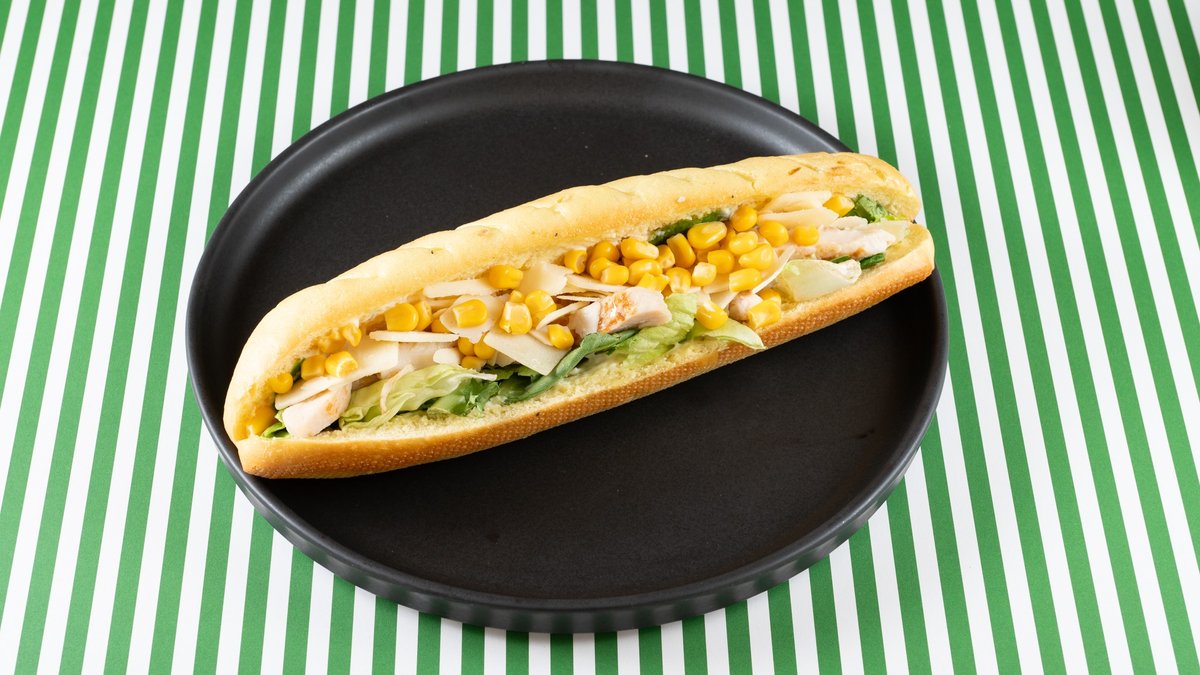 Λευκό panini, φιλέτο κοτόπουλο, τυρί, καλαμπόκι, ρόκα και σως