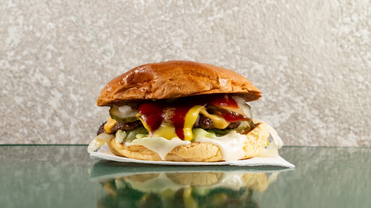 100% μοσχαρίσιο μπιφτέκι, τσένταρ, κέτσαπ, μουστάρδα, μαγιονέζα, μαρούλι, ψιλοκομμένο κρεμμύδι, πίκλες