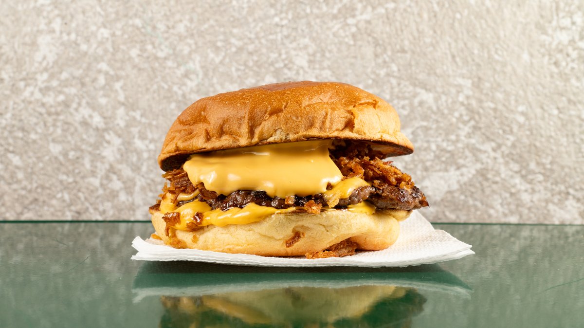 100% μοσχαρίσιο μπιφτέκι, τσένταρ, καραμελωμένα κρεμμύδια, τραγανά κρεμμύδια, σως τσένταρ