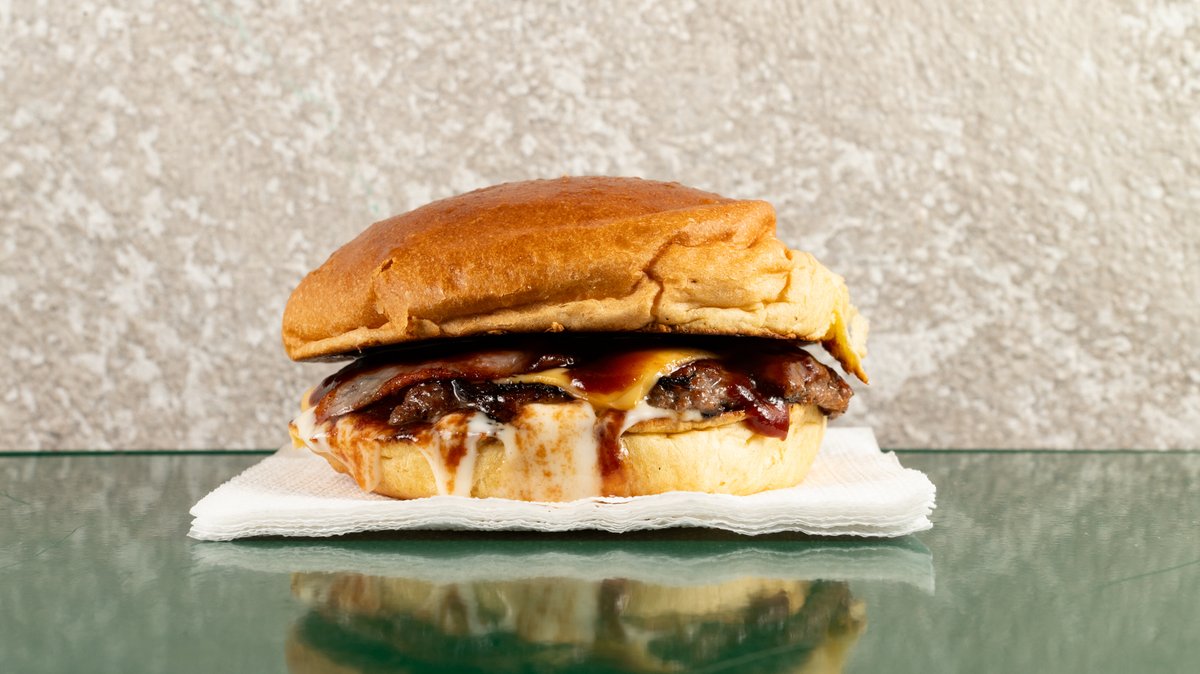 100% μοσχαρίσιο μπιφτέκι, τσένταρ, μπέικον, καραμελωμένα κρεμμύδια, σως bbq, μαγιονέζα