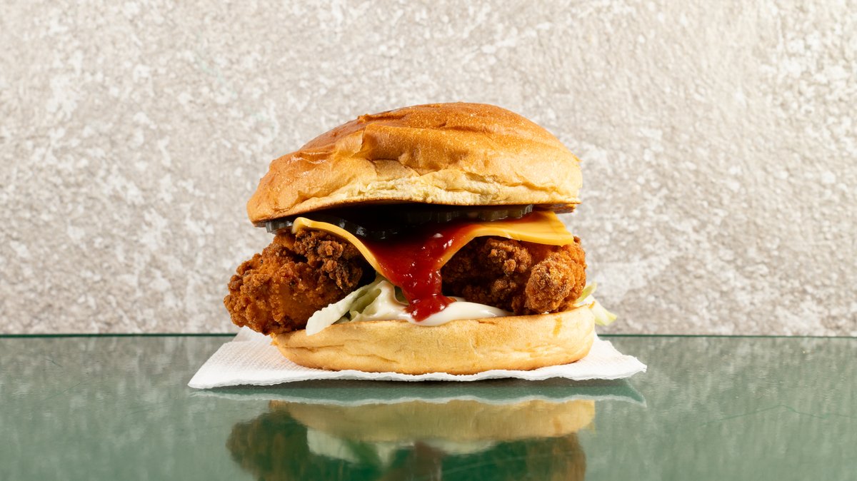 Τραγανό τηγανητό κοτόπουλο, τσένταρ, κέτσαπ, μαγιονέζα, μαρούλι, πίκλες