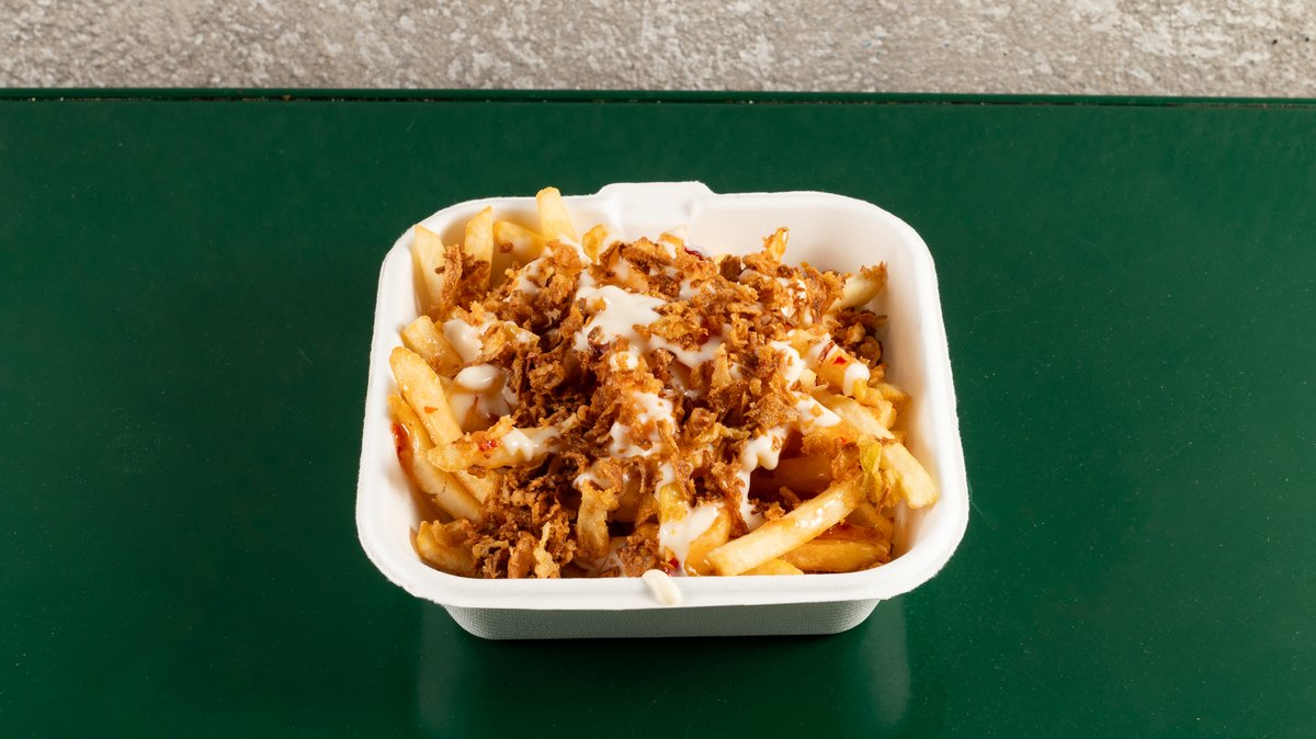 Πατάτες τηγανητές, γλυκό τσίλι, μαγιονέζα, τραγανά κρεμμύδια