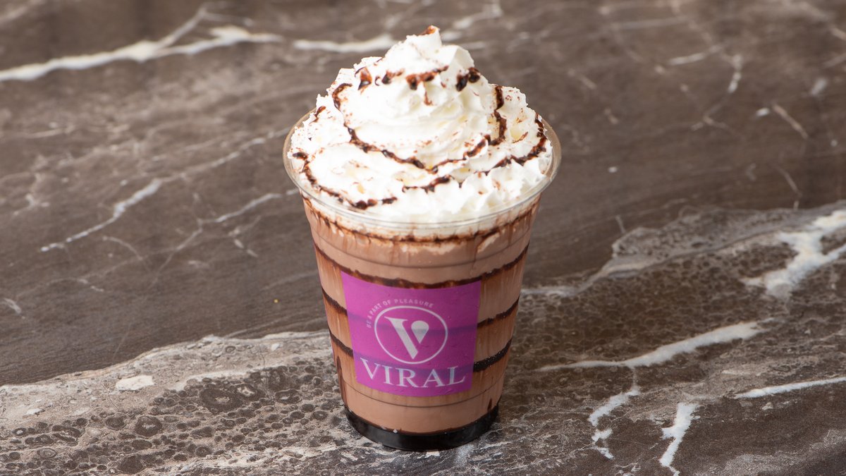 Ζεστή κρεμώδης σοκολάτα σκεπασμένη με σκαλιέτα και σαντιγί χιονισμένη με μπισκότο OREO, M&M's και σιρόπι καραμέλας