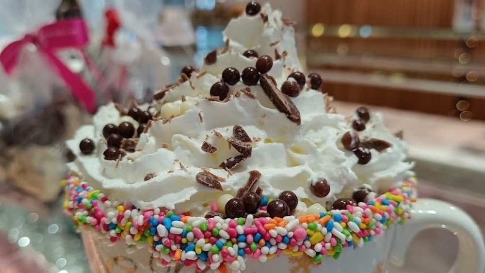 Ζεστή κρεμώδης σοκολάτα σκεπασμένη με πολύχρωμη τρούφα και σαντιγί χιονισμένη με ξύσμα σοκολάτας και crispy mix