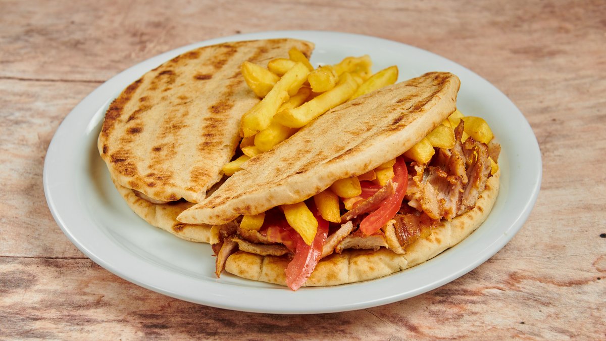 Συνοδεύεται από πίτα, πατάτες τηγανητές, ντομάτα, κρεμμύδι και τζατζίκι