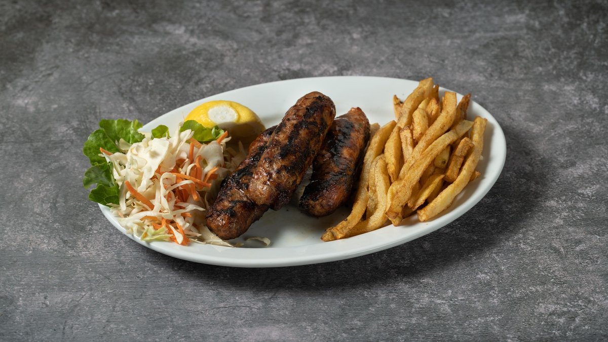 5 Τεμάχια. Πικάντικο. Σπιτικό. Συνοδεύεται από πατάτες τηγανητές, ντομάτα και κρεμμύδι