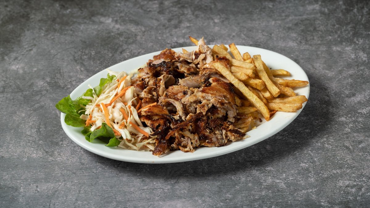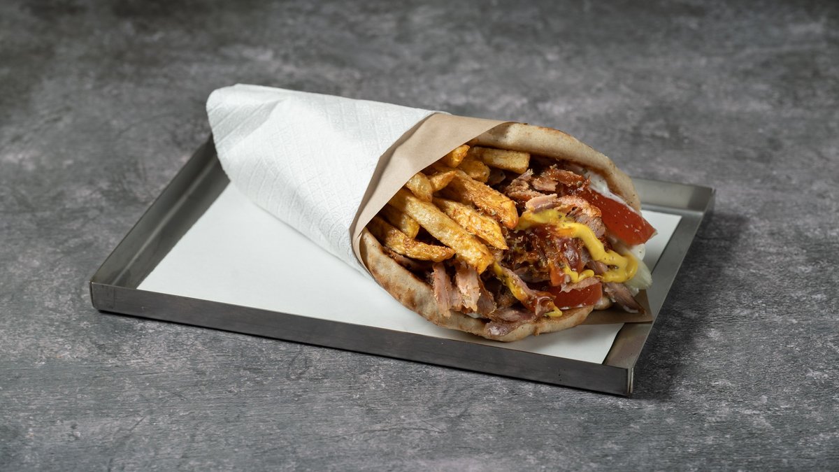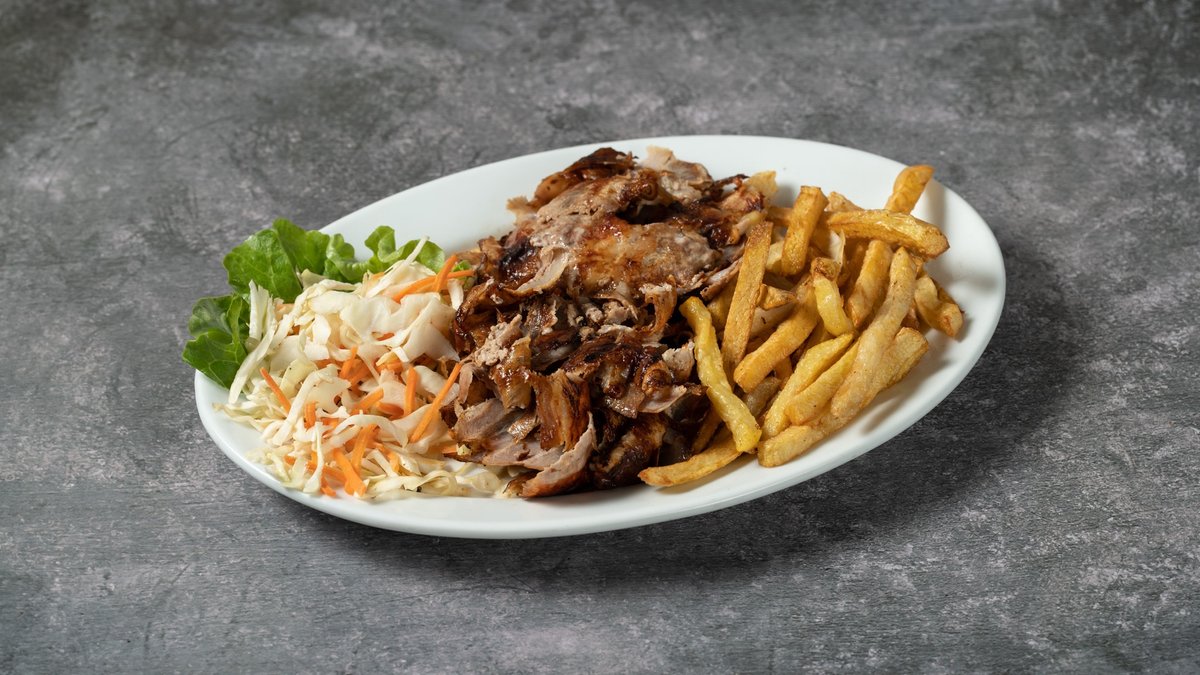 Με γύρο χοιρινό, ντομάτα και κρεμμύδι. Συνοδεύεται από πατάτες τηγανητές