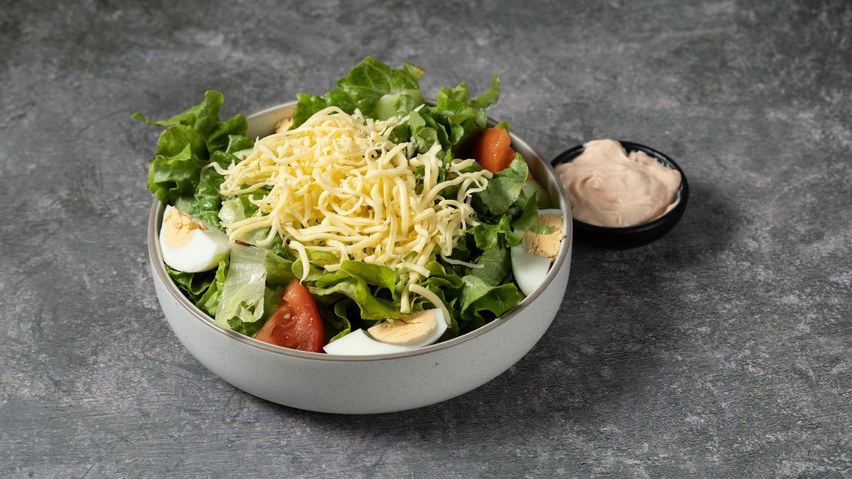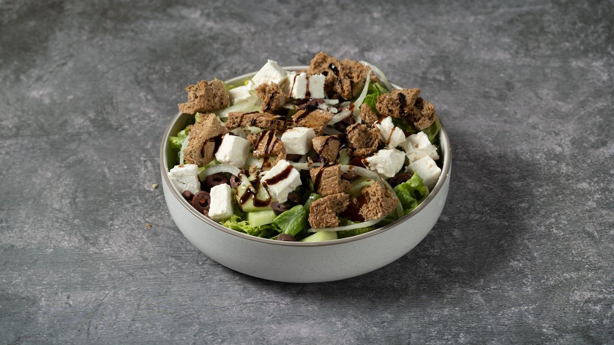 Iceberg, ρόκα, μαρούλι, ντοματίνια, ντάκος, φέτα και σως balsamico.