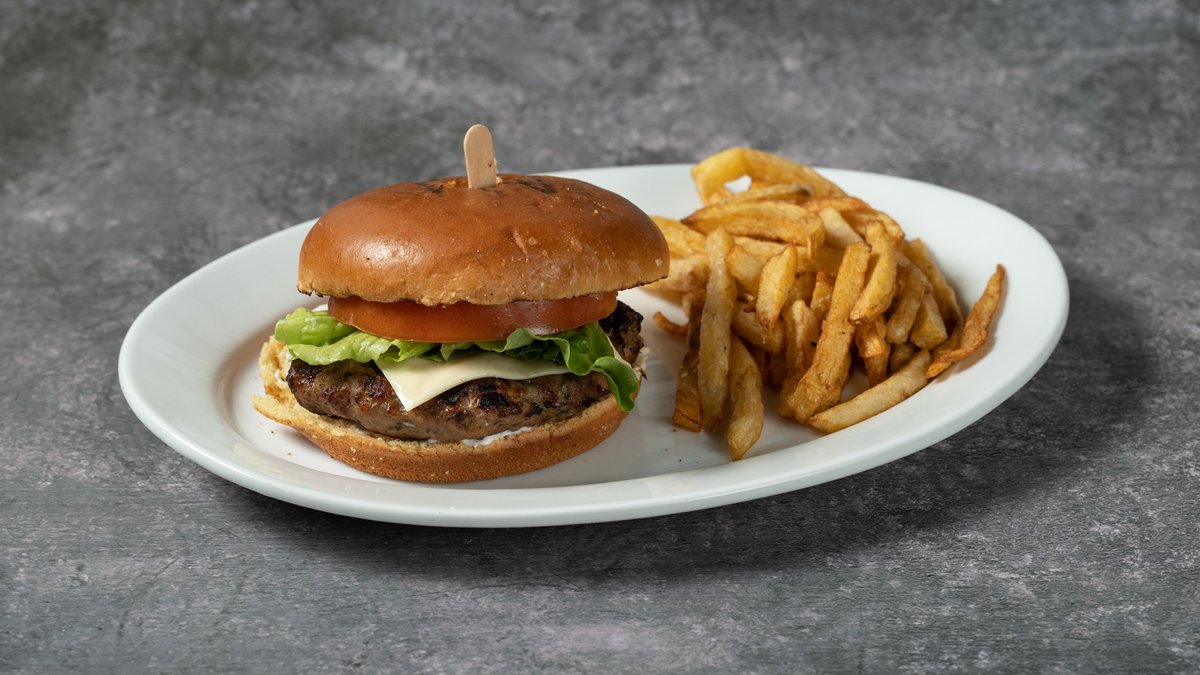 Ψωμί brioche με μπιφτέκι από κιμά μοσχαρίσιο Black Angus, ντομάτα, μαρούλι, μπέικον και σως γιαουρτιού. Συνοδεύεται από πατάτες τηγανητές φρέσκες