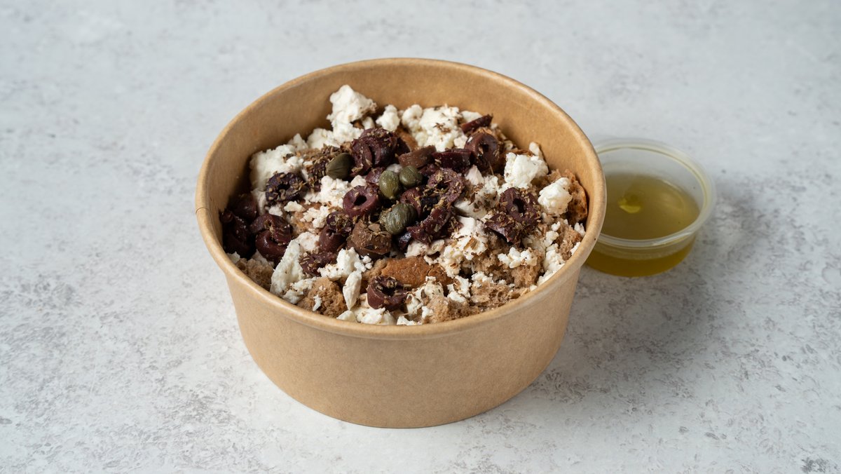 Με κρητικό παξιμάδι, ντομάτα, τριμμένη φέτα, ελιές, κάπαρι και λάδι