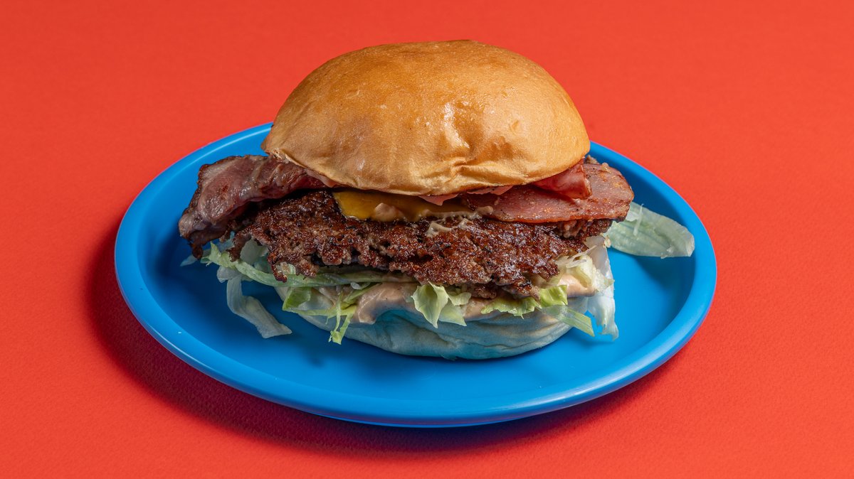 Potato roll, balboa μαγιονέζα, iceberg, διπλό smashed beef patty, τυρί cheddar και μπέικον