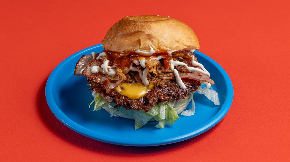 Potato roll, μαγιονέζα, iceberg, διπλό smashed beef patty, τυρί cheddar, μπέικον, smoky bo bbq sauce, σιγομαγειρεμένα μοσχαρίσια ribs, sour cream και τηγανητό κρεμμύδι