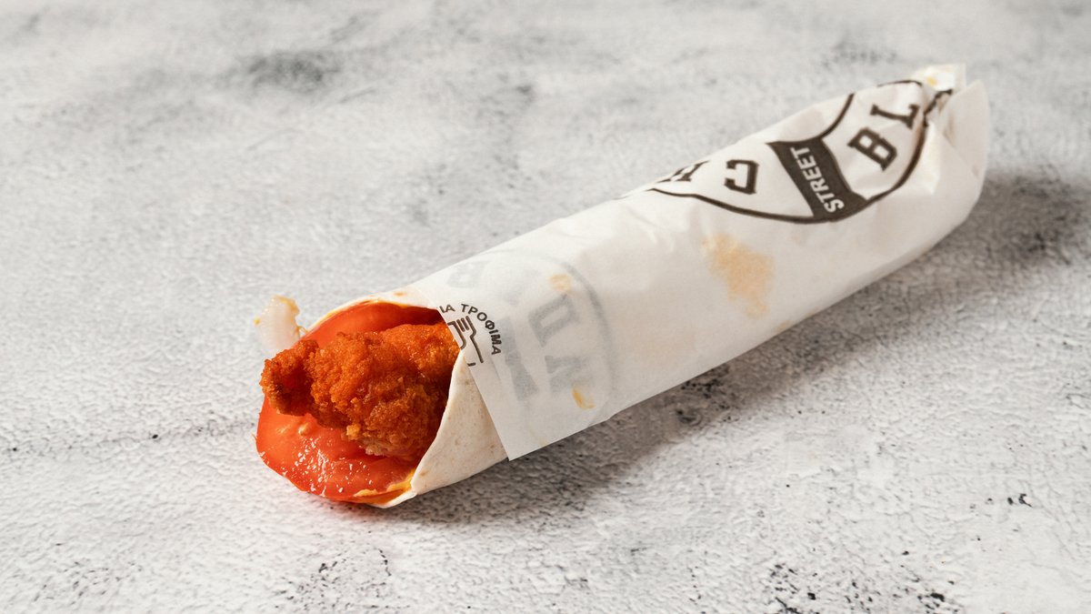 Με ψωμάκι, τραγανά strips, ντομάτα, iceberg, πατάτες και sauce επιλογής.