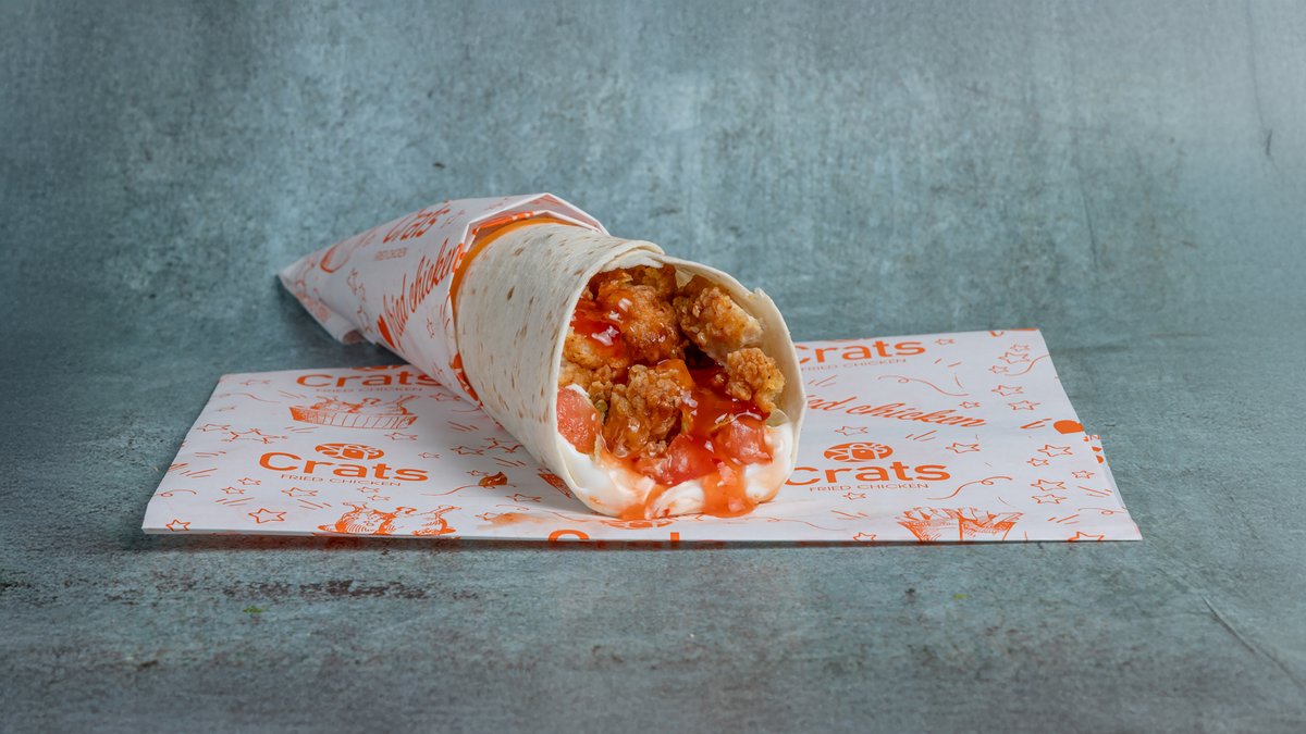 Ψωμί Lavas 30cm, 5 φιλετάκια κοτόπουλου , (Hot) sriracha sauce cheddar, 5 φέτες bacon, iceberg, ντομάτα και μαγιονέζα. Συνοδεύεται από πατάτες Cajun και bbq sauce
