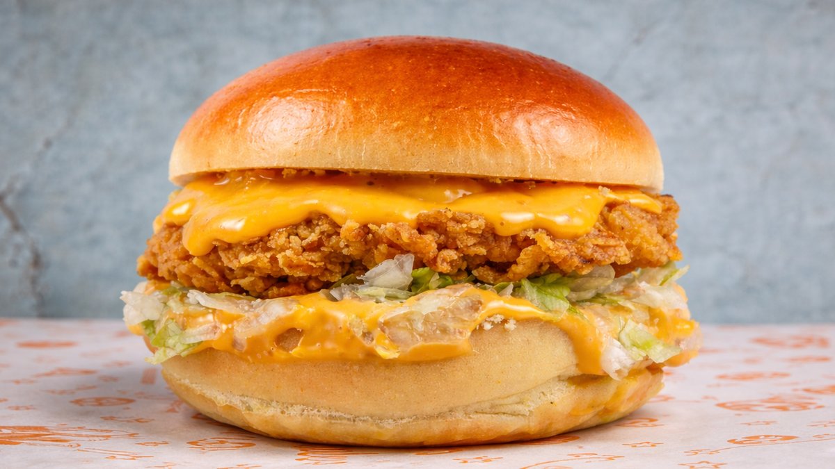 Ψωμί brioche με τραγανό φιλέτο κοτόπουλο, 4 bomb cheese, μπέικον, cheddar, iceberg, ντομάτα, μαγιονέζα και BBQ sauce. Συνοδεύεται από πατάτες τηγανητές με μπέικον και cheddar