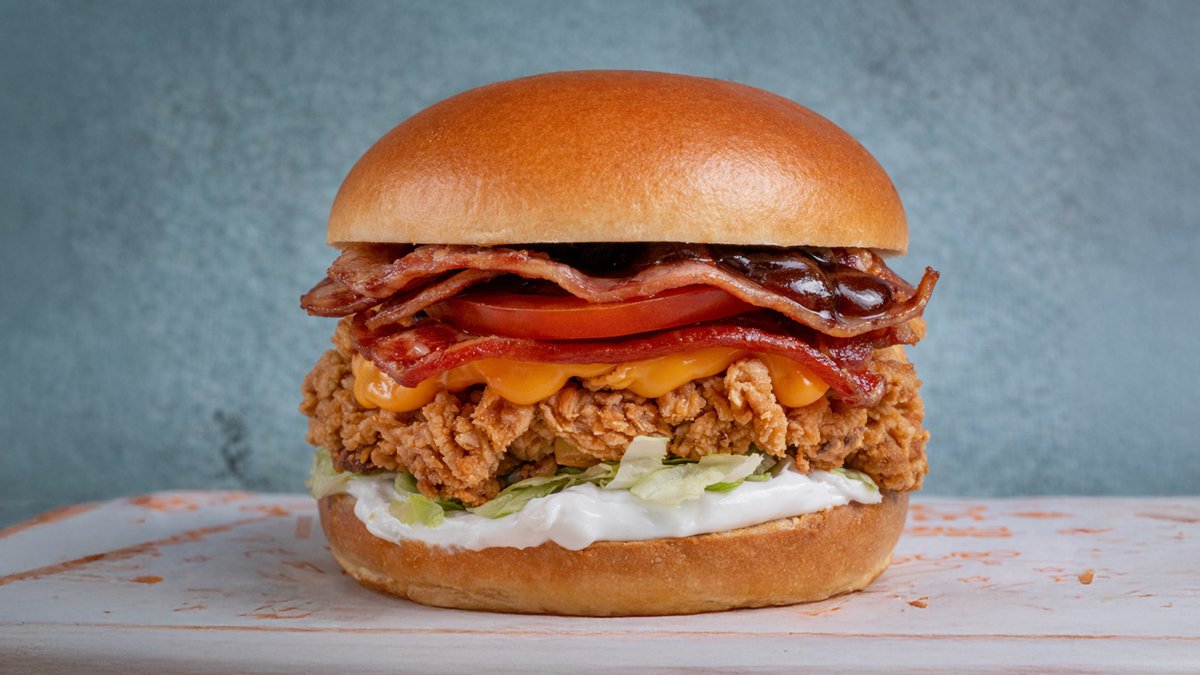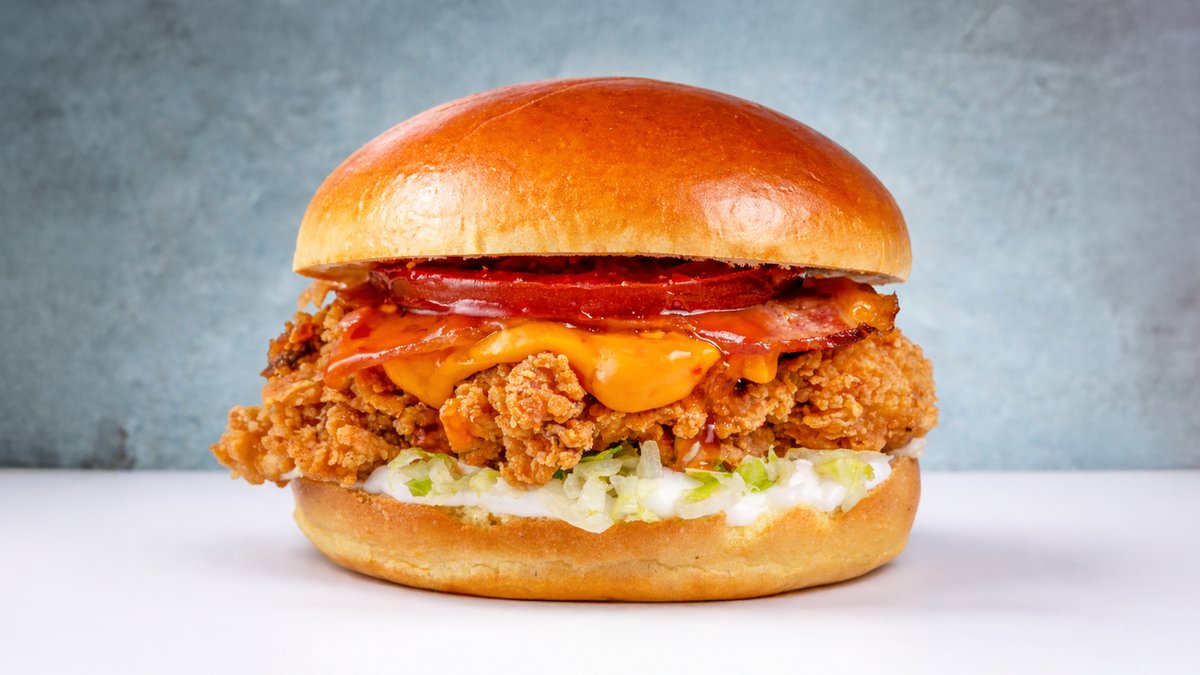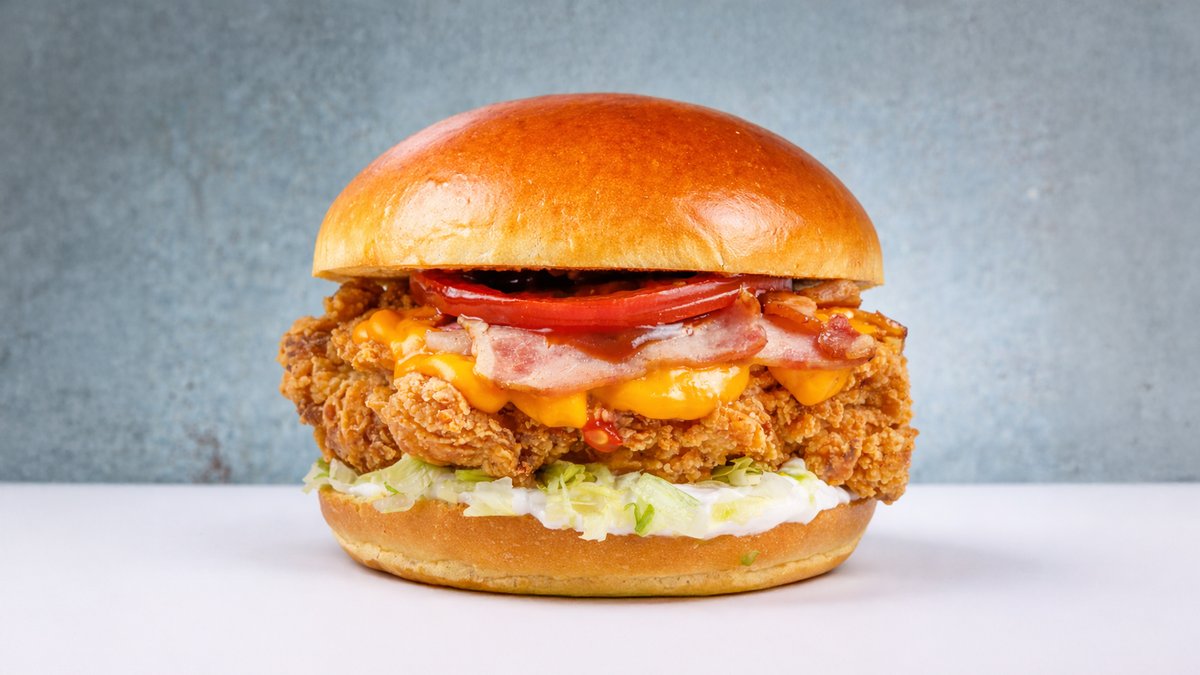Ψωμάκι Βrioche με δύο στρώσεις τραγανά φιλετάκια κοτόπουλο, cheddar, bacon, iceberg, ντομάτα, μαγιονέζα και bbq sauce
