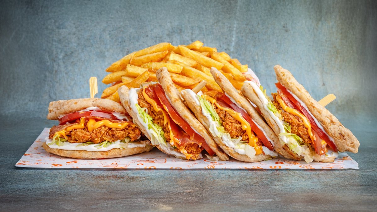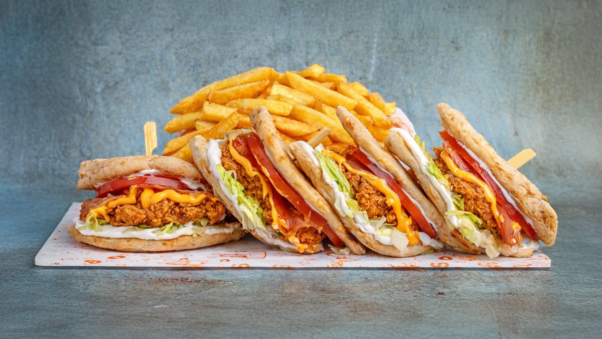 Τραγανά φιλετάκια κοτόπουλο ανάμεσα σε δύο χειροποίητες πίτες, cheddar, bacon, iceberg,ντομάτα και μαγιονέζα. Συνοδεύεται από πατάτες Cajun