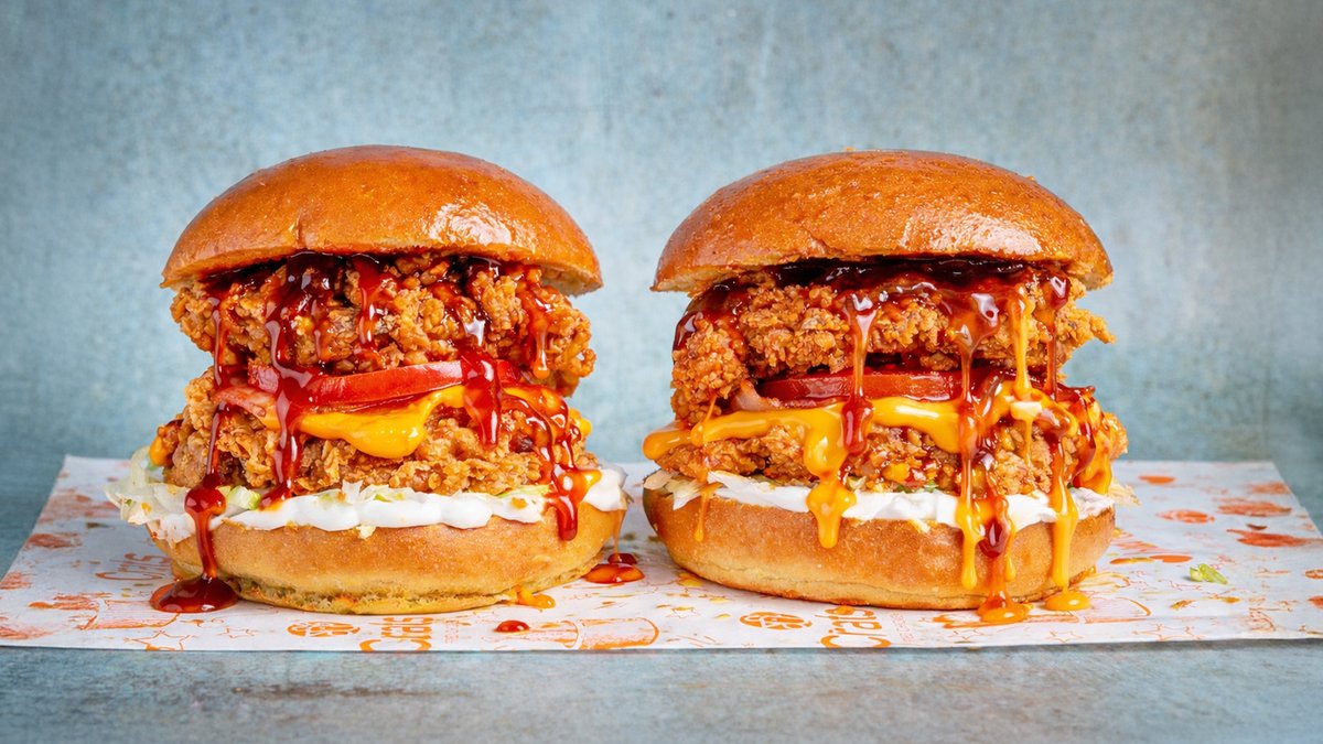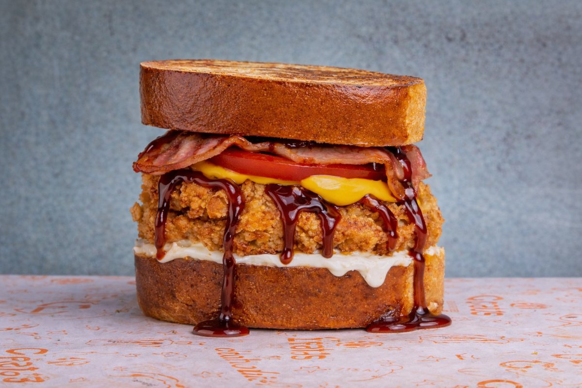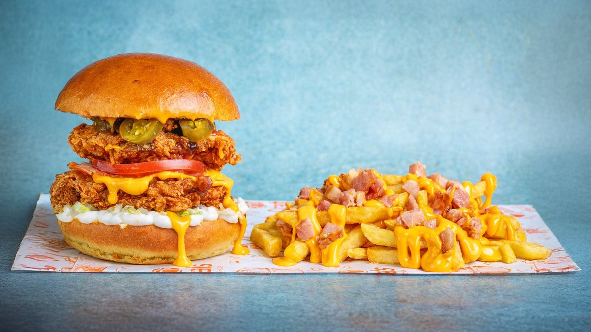Ψωμάκι brioche με δύο στρώσεις τραγανά φιλετάκια κοτόπουλο, jalapenos, cheddar, bacon, iceberg, ντομάτα, μαγιονέζα και bbq sauce.Συνοδεύεται από πατάτες Cajun με καβουρδισμένο bacon και cheddar sauce