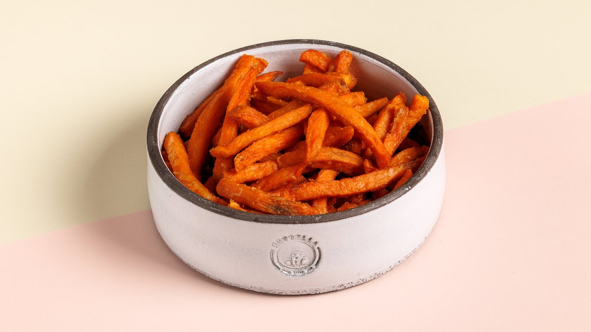 Με βραστό λουκάνικο, καραμελωμένο κρεμμύδι, cheddar, μπέικον, ketchup και μουστάρδα. Συνοδεύεται από πατάτες τηγανητές