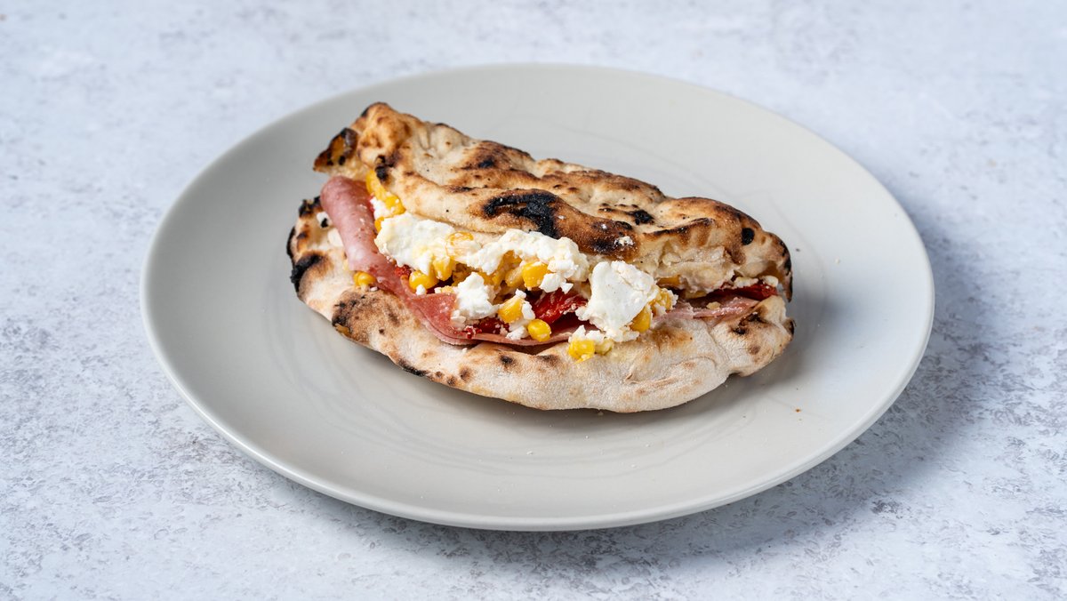 Με κασέρι, μανούρι, σαλάμι αέρος, μπριζόλα καπνιστή, ντομάτα, αγγούρι και philadelphia