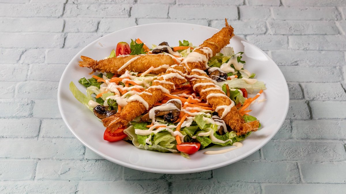 Με γαρίδες πανέ, μαρούλι, λάχανο, καρότο φρέσκα, μανιτάρια τοματάκια, ελαιόλαδο και βαλσάμικο