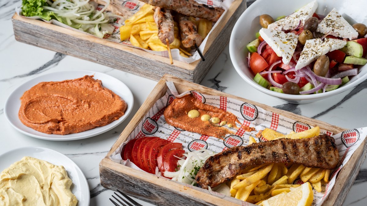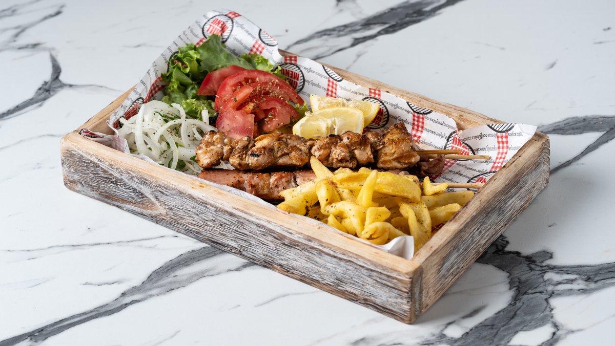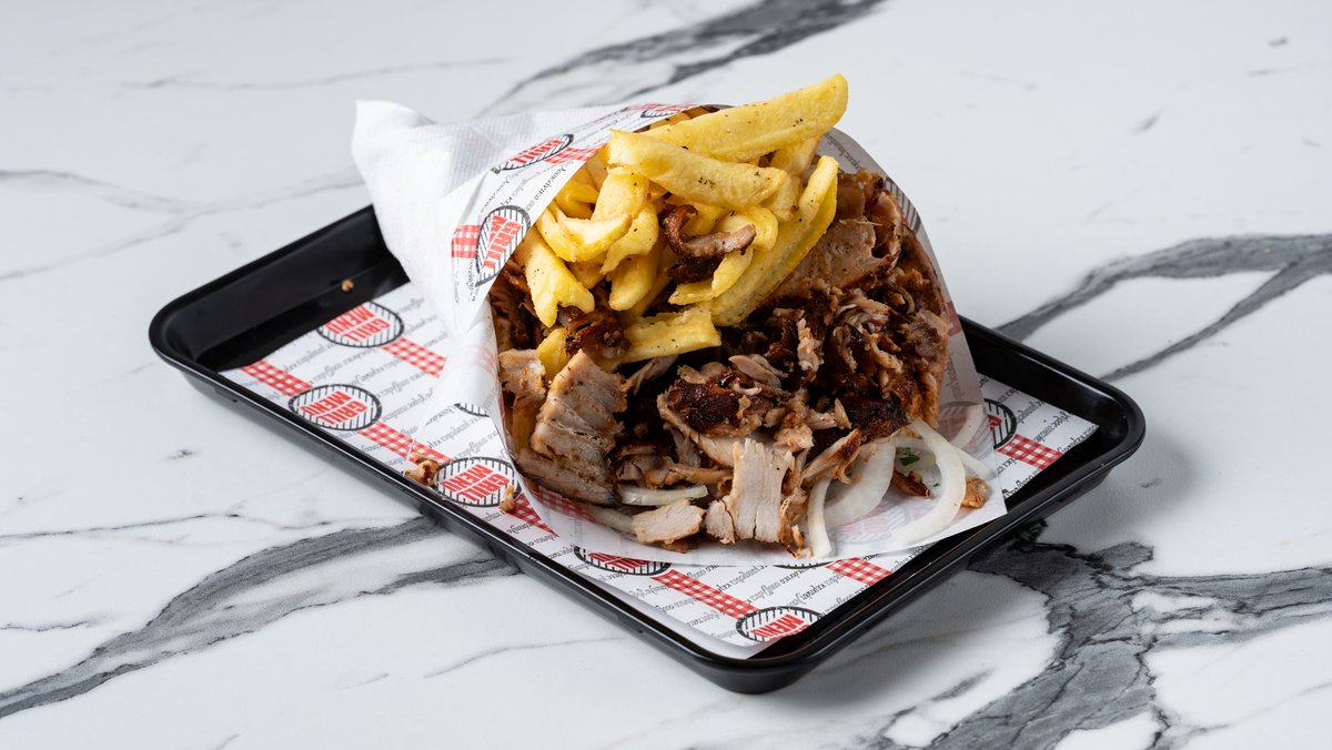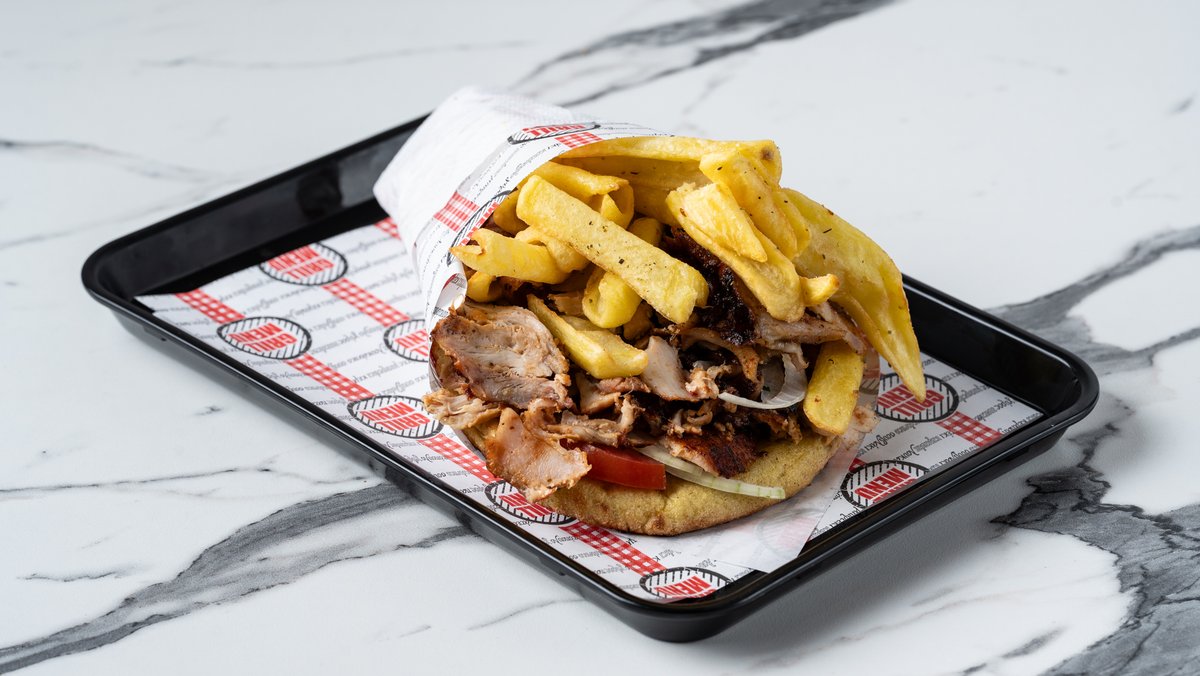 Με πίτα 21 cm, διπλή δόση γύρου, ντομάτα, κρεμμύδι, τηγανητές πατάτες, μουστάρδα και κέτσαπ