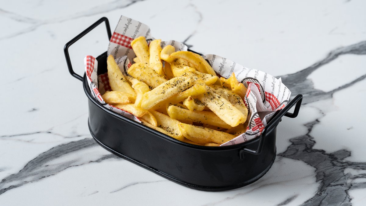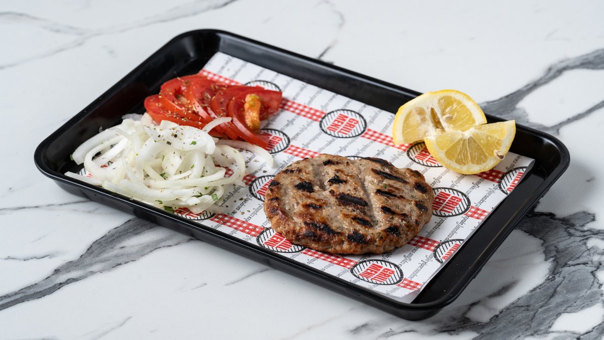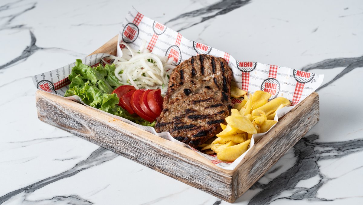 Με μοσχαρίσιο μπιφτέκι 120 g, αγγουρομαγιονέζα, μαρούλι, ντομάτα, μουστάρδα και κέτσαπ. Συνοδεύεται από πατάτες τηγανητές