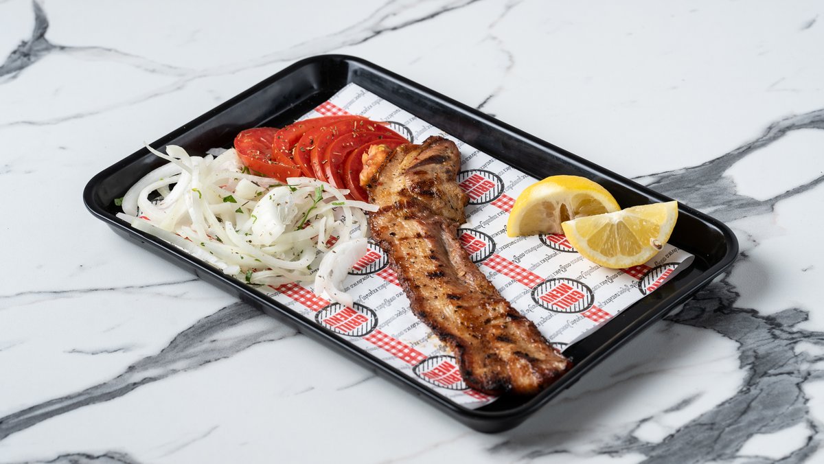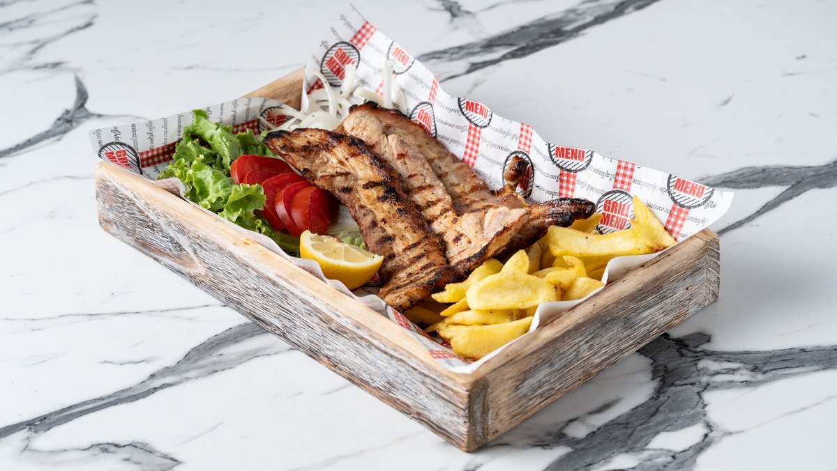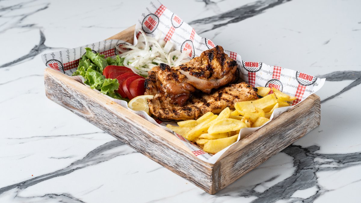 120 g. Συνοδεύεται από σαλάτα εποχής και πατάτες τηγανητές