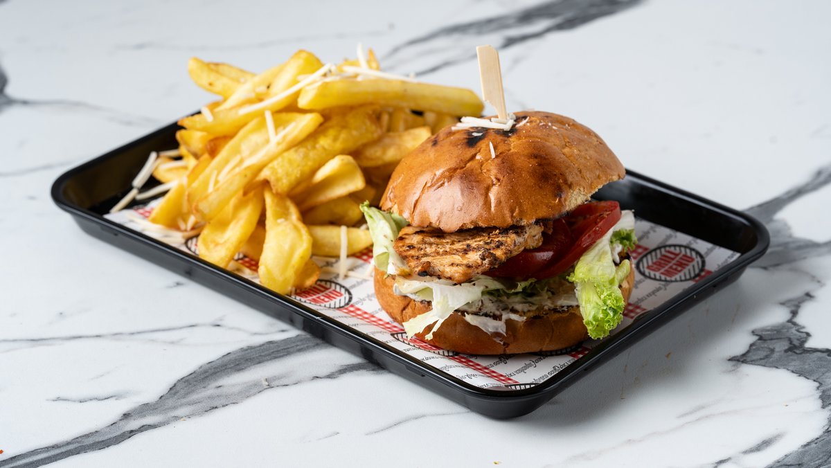 Με στήθος κοτόπουλο ή πανέ, τυρί τσένταρ, σως μουστάρδας, μαρούλι και ντομάτα. Συνοδεύεται από πατάτες τηγανητές