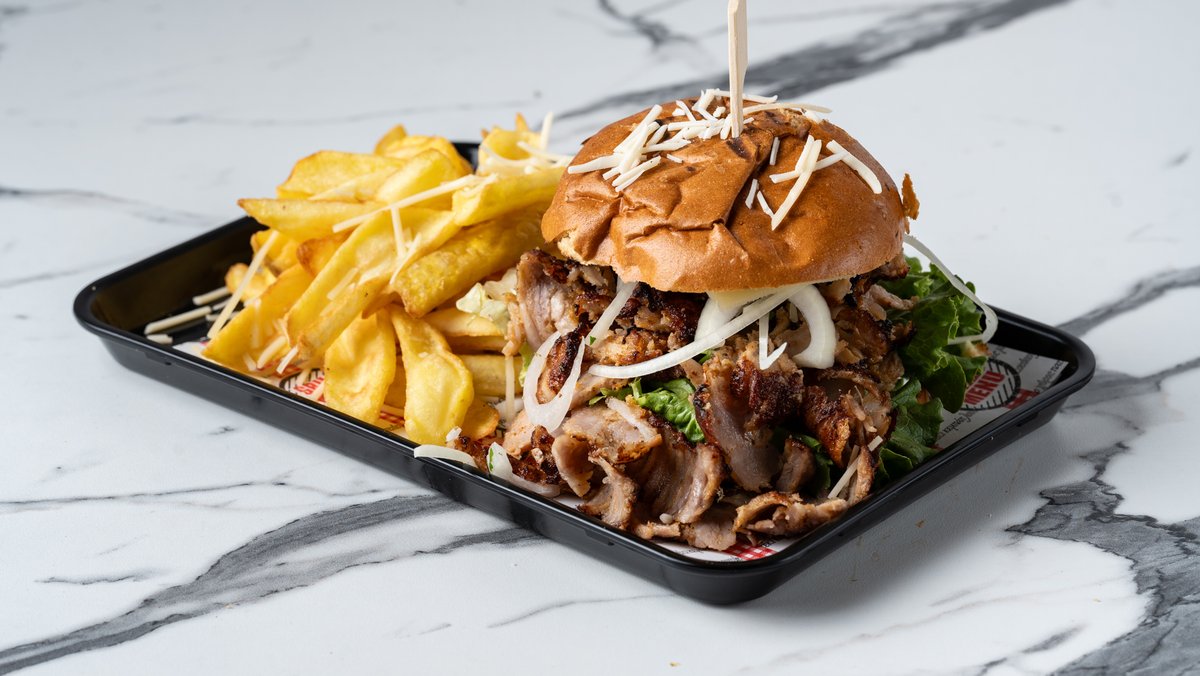 Με γύρο χοιρινό, τυρί τσένταρ, σως γιαουρτιού, iceberg και κρεμμύδι. Συνοδεύεται από πατάτες τηγανητές
