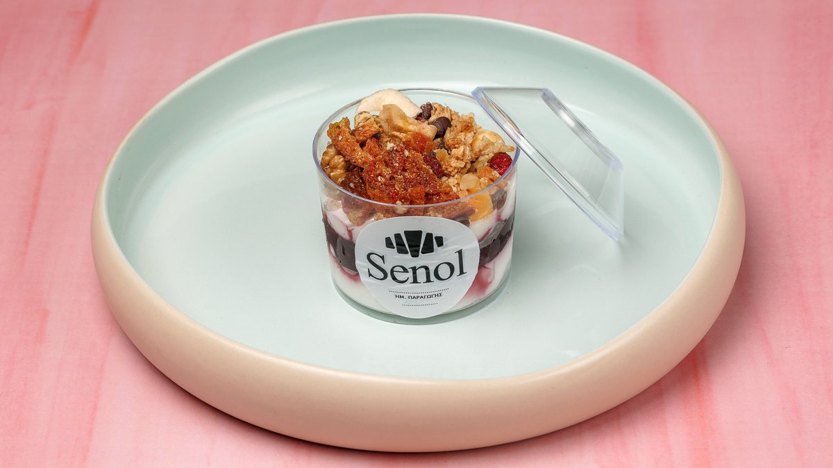 Γιαούρτι με γκρανόλα, καραμέλα και μπισκότο κρουασάν