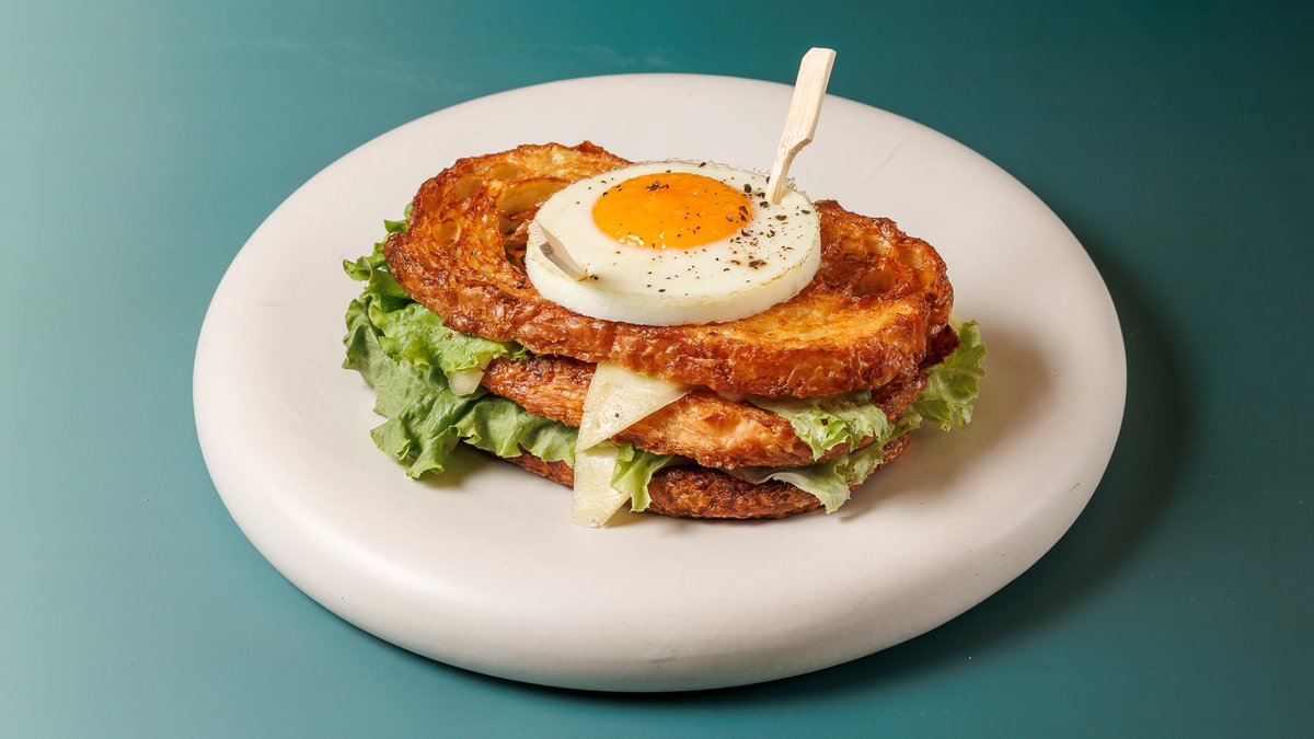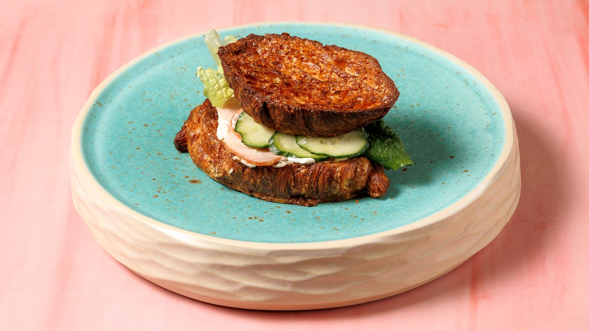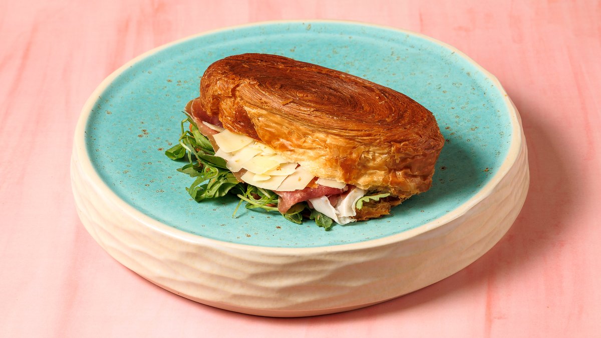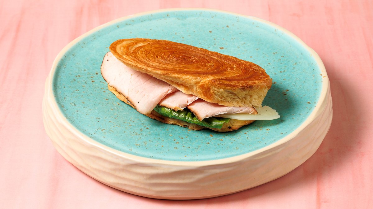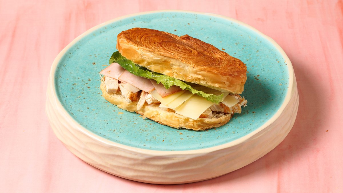 Αυγόφετα κρουασάν, γαλοπούλα, μπέικον, Γκούντα, μαγιονέζα, ντομάτα, μαρούλι, αυγό