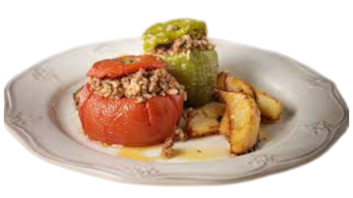 Φρέσκες πιπεριές και ντομάτες γεμισμένες με ρύζι και μυρωδικά, ψημένες στον φούρνο