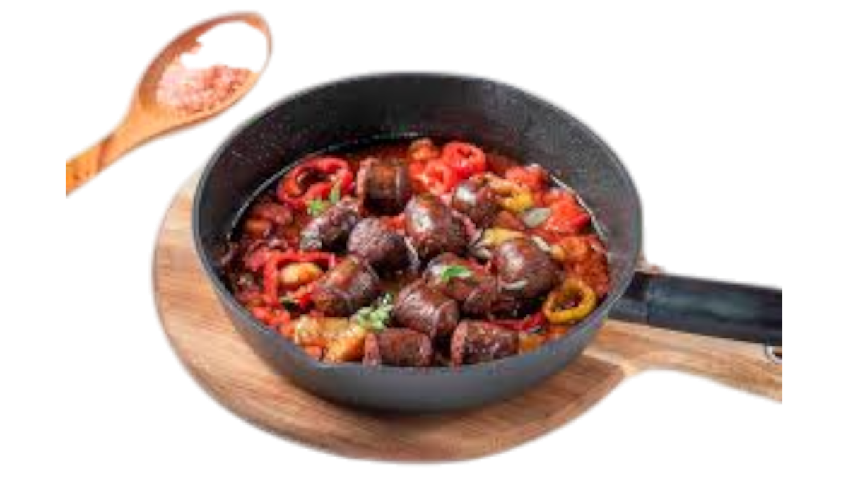 Τρυφερό μοσχαράκι κομμένο σε μικρά κομμάτια μαγειρεμένο σε σάλτσα ντομάτας.