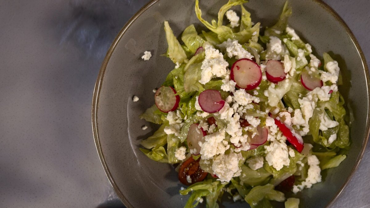 Τραγανό iceberg με ραπανάκι, ντοματίνια και φέτα, συνοδευόμενο από πλούσια σως μουστάρδας.
