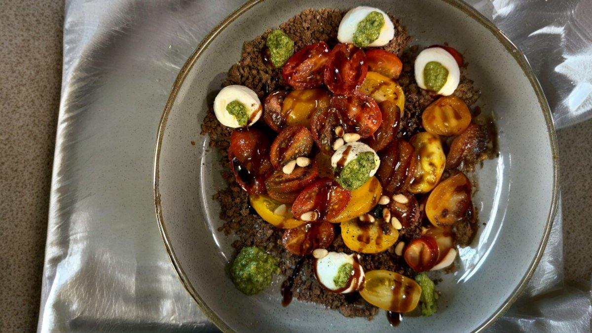 Αρωματικό φρέσκο πέστο βασιλικού συνδυάζεται με ζουμερά ντοματίνια, πέρλες μοτσαρέλα και τραγανό παξιμάδι χαρουπιού
